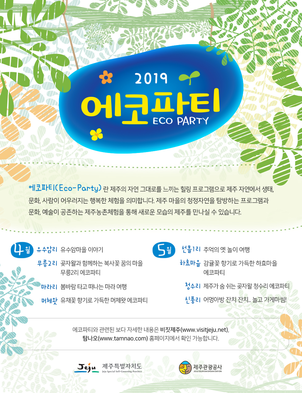 곶자왈과 함께하는 복사꽃 꿈의 마을 무릉2리, 추억의 옛 놀이 여행 선흘1리, 감귤꽃 향기로 가득한 하효마을 등 각 마을별로 각각 다른 주제로 진행되기에 제주마을의 다양한 경험을 할 수 있는 절호의 기회입니다. 에코파티에 참가하기 위해서는 사전예약이 필수입니다. 아래의 사전예약 페이지에서 원하는 날짜와 마을을 선택한 후에 온라인으로 납부까지 가능합니다.