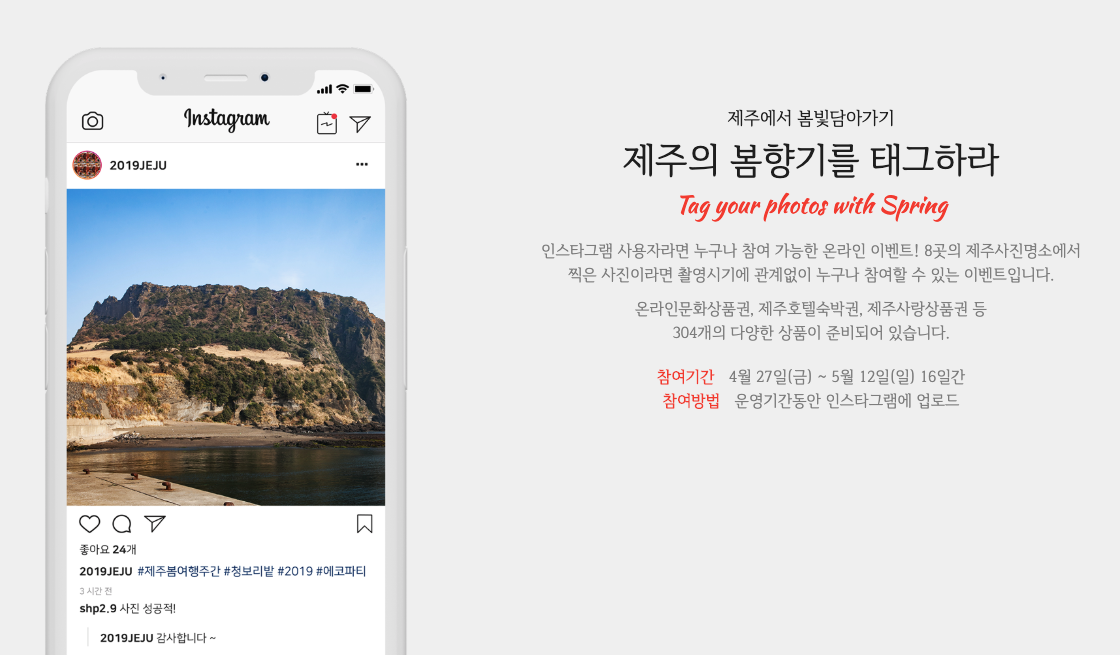 '제주의 봄향기를 태그하라'는 8개의 명소에서 찍은 사진을 인스타그램에 업로드 하면 참가할 수 있는 온라인 이벤트입니다. 4월 27일부터 5월 12일까지 촬영시기에 상관없이 8개의 명소에서 찍은 사진을 지정된 해시태그와 함께 자신의 인스타그램 계정에 업로드 하면 바로 참여가 가능합니다. 온라인문화상품권, 제주호텔숙박권, 제주사랑상품권 등 304개의 상품이 준비되어 있다고 하니 지난 앨범을 뒤져보는 건 필수겠죠? 잠자고 있는 8개의 제주명소 사진을 꺼내보세요!