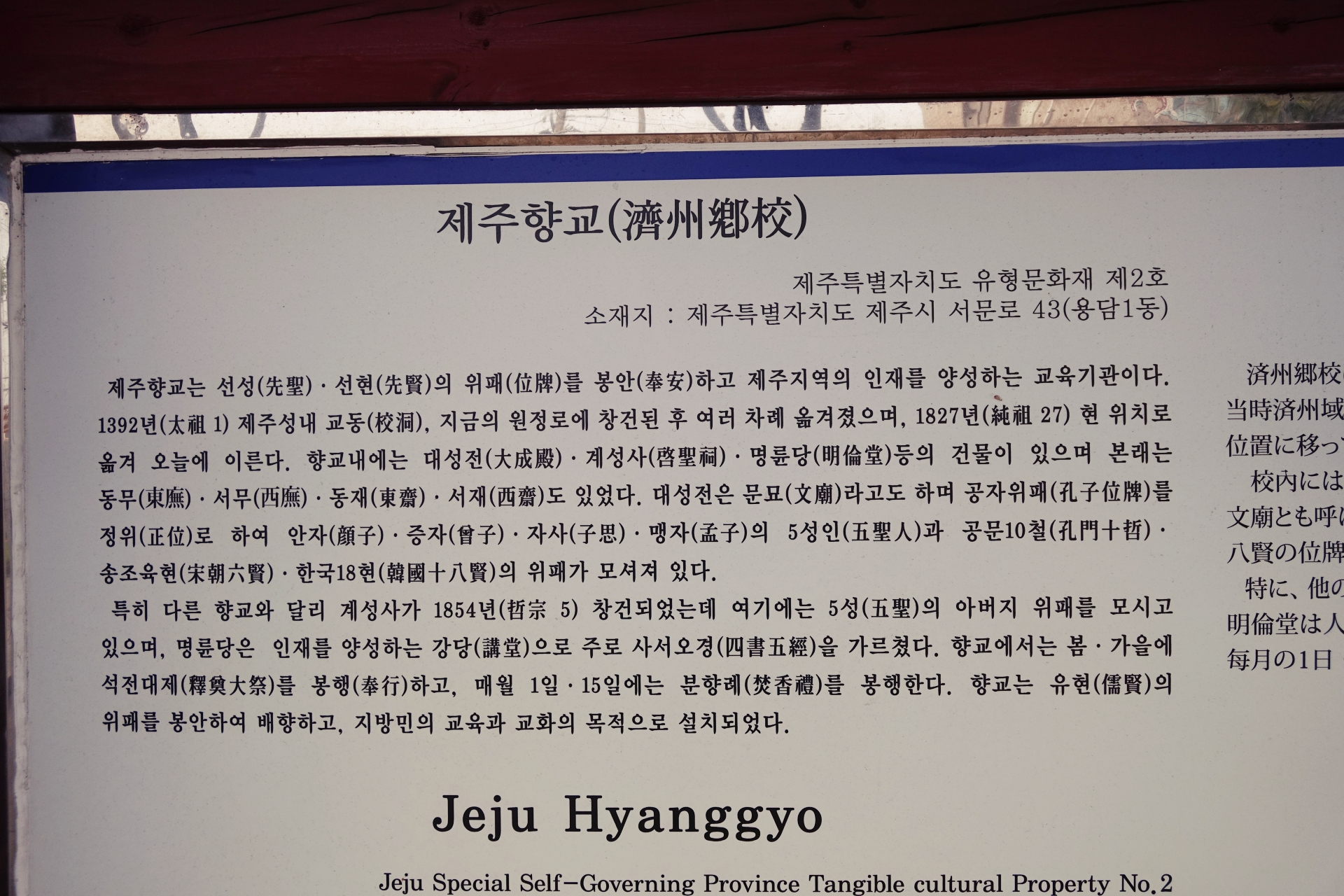 제주향교는 조선시대 제주지역의 인재를 양성하기 위해 세운 국립교육기관으로 제주특별자치도 유형문화재 제2호로 지정되어 있습니다. 제주향교는 원래 관덕정 아래쪽에 창건되어 여러 차례 옮겨졌다가 순조 27년(1827년) 현 위치에 이르러 오늘날까지 자리하고 있다고 합니다.