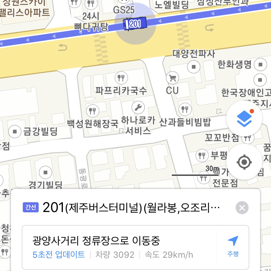 '카카오맵을 실행해도 버스가 안 보여요?'라고 하시는 분들이 계실 거예요. 카카오맵 기본 설정에서는 원래 보이지 않습니다. 그렇게 때문에 지도 설정에서 세부 정보 레이어 '제주버스'를 꼭 활성화해줘야 합니다. 그러면 보이지 않던 버스 아이콘이 나타나고 아이콘 위에는 노선번호가 적혀 있어 쉽게 확인할 수 있습니다.
