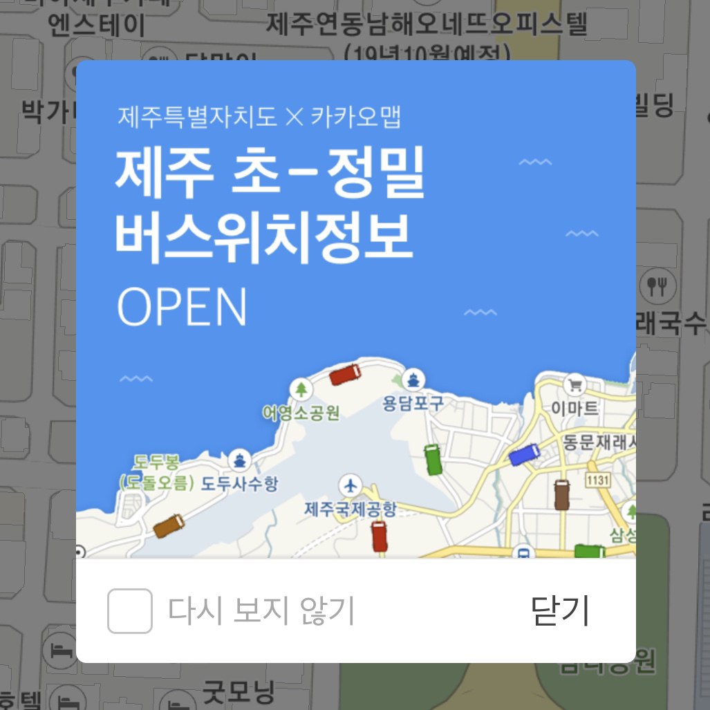그렇다면 누구나 카카오맵을 통해 확인할 수 있는 초정밀 버스위치정보 서비스! 카카오맵을 어떻게 사용하면 되는지 간단하게 설명해 드리려고 합니다. 카카오맵에서 '제주 초정밀 버스위치정보' 서비스에 대한 공지나 내용을 확인할 수 있습니다.