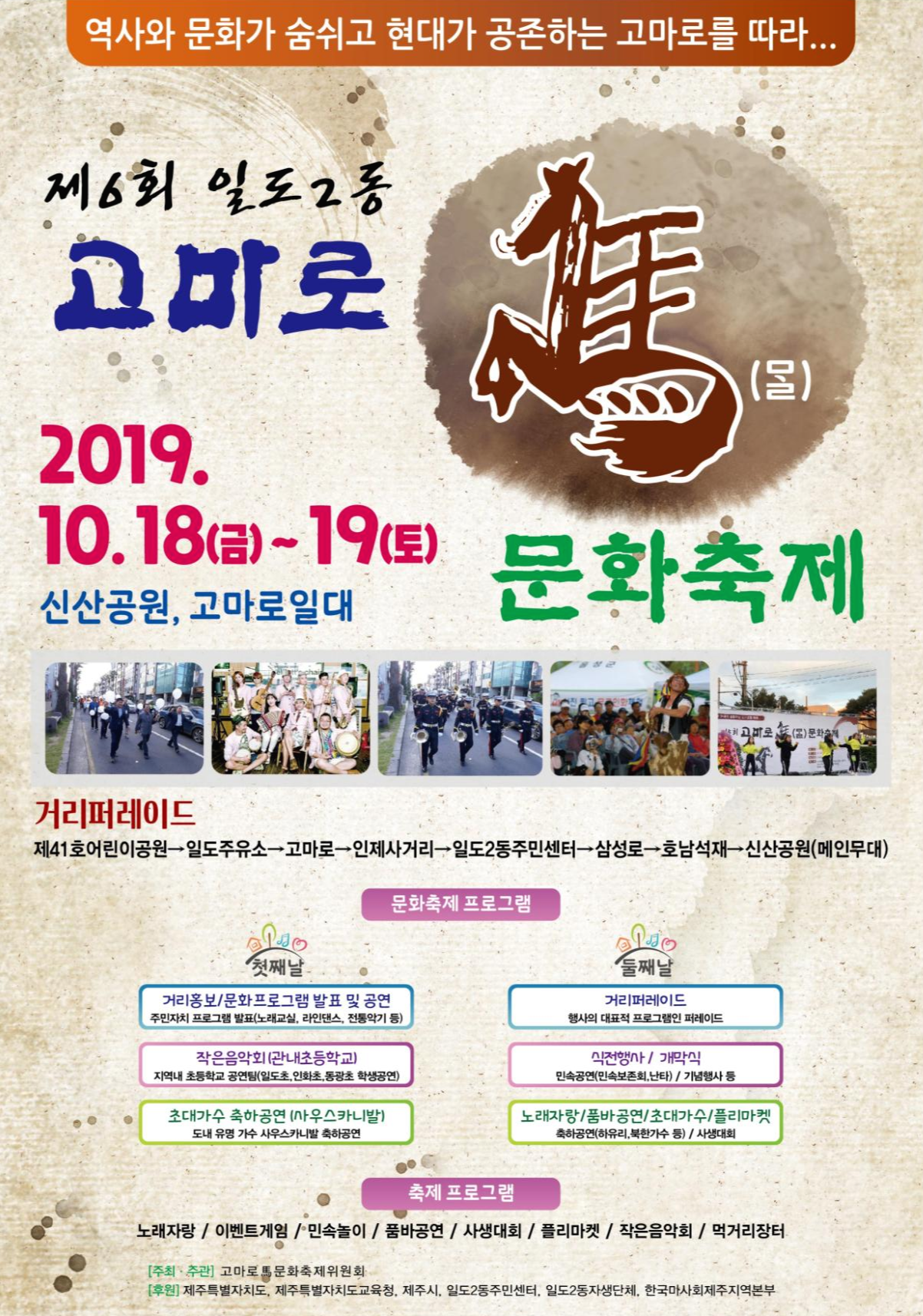 제주시 일도2동 고마로마문화축제위원회(위원장 오영진)는 오는 10월 18일(금)부터 19일(토) 2일간 고마로 거리와 신산공원 일원에서 『역사와 문화가 숨쉬고 현대가 공존하는 고마로를 따라...』라는 주제로 '제6회 고마로 마(馬)문화축제'를 개최한다고 밝혔습니다. 일도2동 고마로마문화축제위원회가 주최·주관하는 이번 축제는 고마로 거리홍보와 다채로운 공연이 펼쳐집니다.