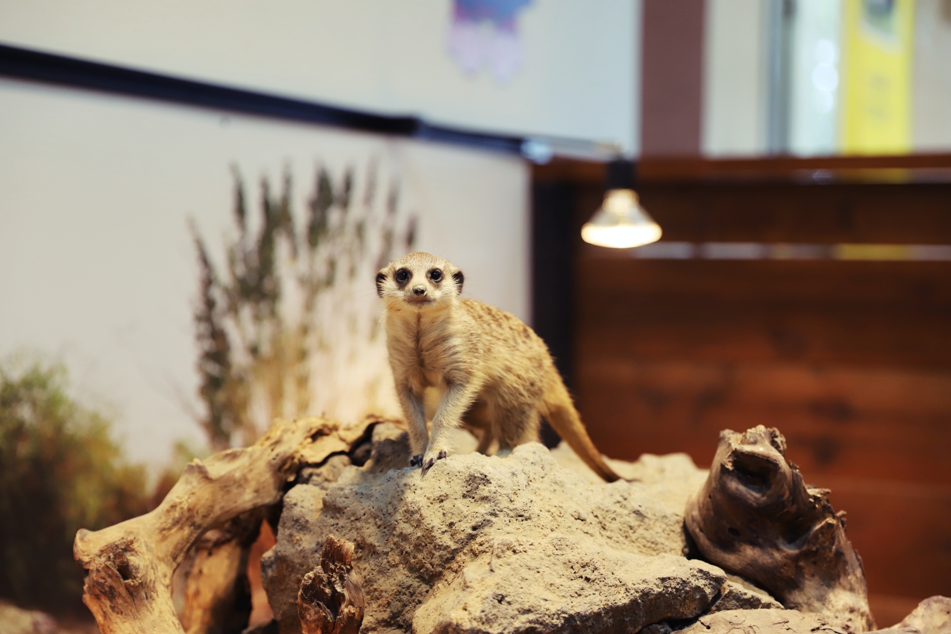 '동물의 왕국' 같은 다큐멘터리 프로그램에서 두 발로 꼿꼿하게 차렷 자세로 주위를 살피는 망보기 선수, 두 번째 친구는 바로 미어캣입니다. 제주공룡랜드 앵무새사파리의 가족이 된 지 얼마 되지 않은 친구들이에요. 워낙 호기심이 많은 친구들이라 우리 아이들이 가까이 가면 무엇이 그리 궁금한지 가까이 오려고 점프까지 뛴답니다.