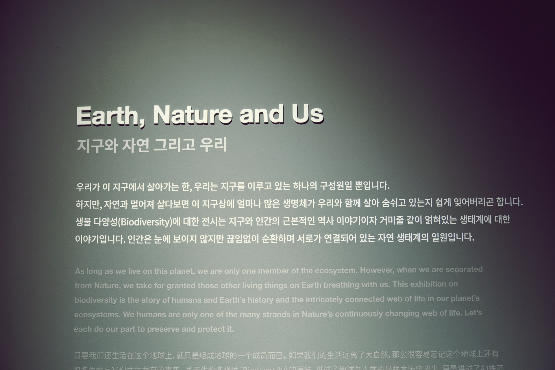 생물다양성에 대한 개념과 다양한 종의 생명체가 어우러져 살고 있는 지구의 약 46억 년 역사에 대한 전시공간입니다. 우리 눈에 보이지 않는 아름다운 생명체들도 함께 살고 있는 이 지구는 현재 빠른 환경 변화로 인해 다양한 종의 동식물의 수가 사라져 가고 있다고 합니다.