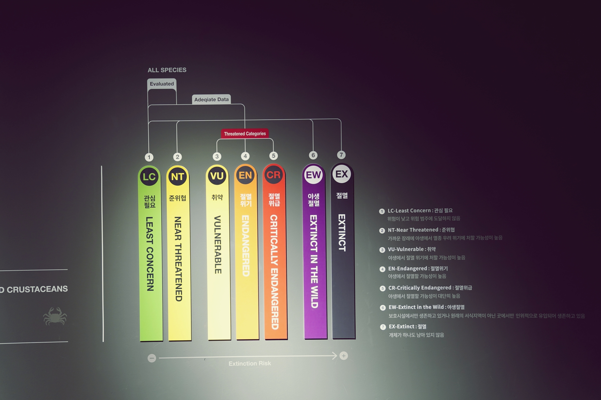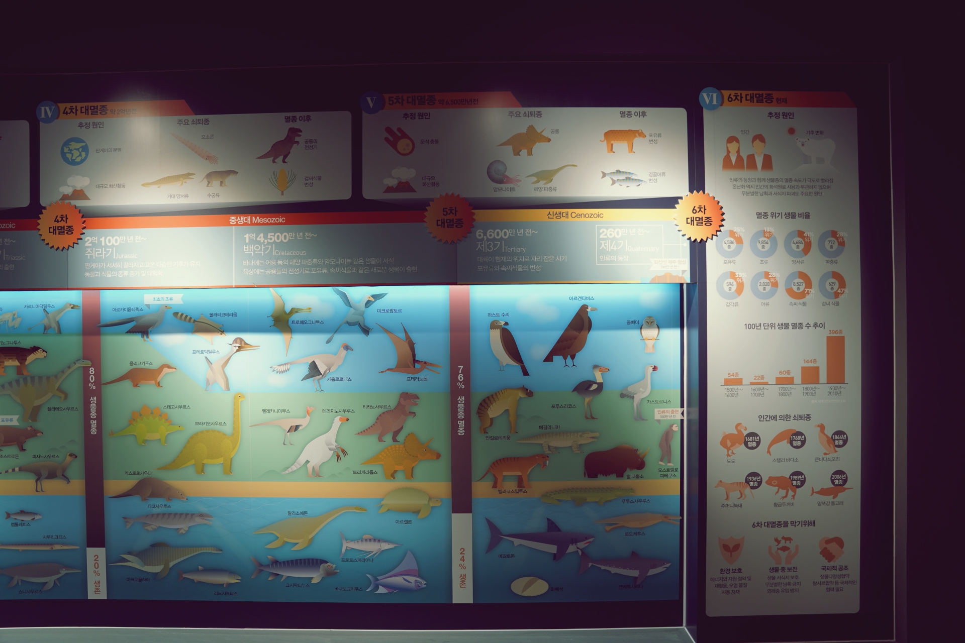 생물다양성에 대한 개념과 다양한 종의 생명체가 어우러져 살고 있는 지구의 약 46억 년 역사에 대한 전시공간입니다. 우리 눈에 보이지 않는 아름다운 생명체들도 함께 살고 있는 이 지구는 현재 빠른 환경 변화로 인해 다양한 종의 동식물의 수가 사라져 가고 있다고 합니다.