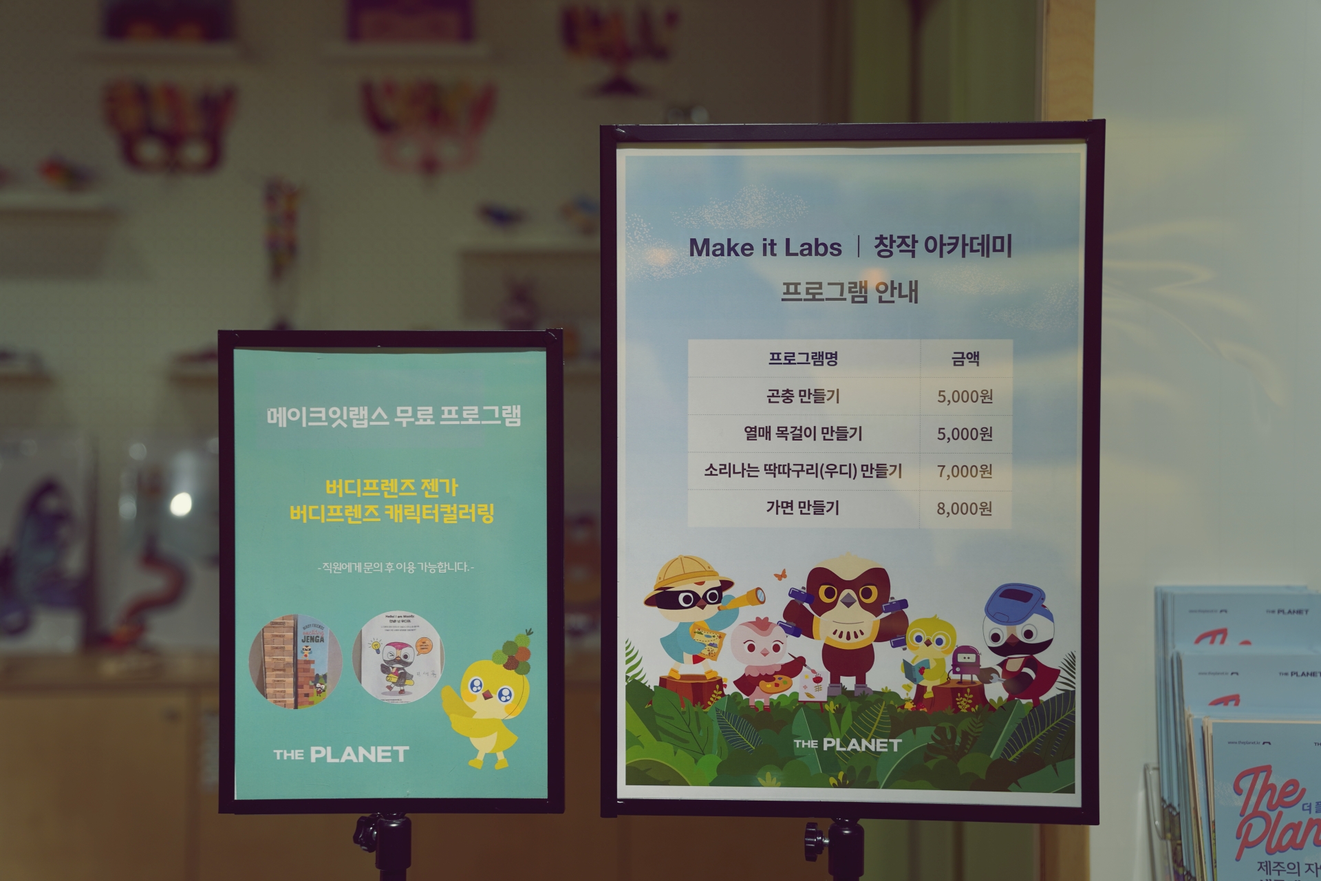 생태문화전시관 더 플래닛은 신비롭고 소중한 제주도의 자연을 새롭게 발견할 수 있도록 아이들뿐만 아니라 가족 모두가 즐길 수 있는 다양한 전시와 교육 콘텐츠가 준비된 공간입니다. 제주의 숲을 주제로 한 '버디프렌즈 캐릭터 전시관'과 지구의 자연을 주제로 한 '생물다양성 전시관'이 상설 운영되며 지하 1층 아카데미에서는 생태, 과학, 예술관련 교육프로그램이 연중 운영된다고 합니다.
