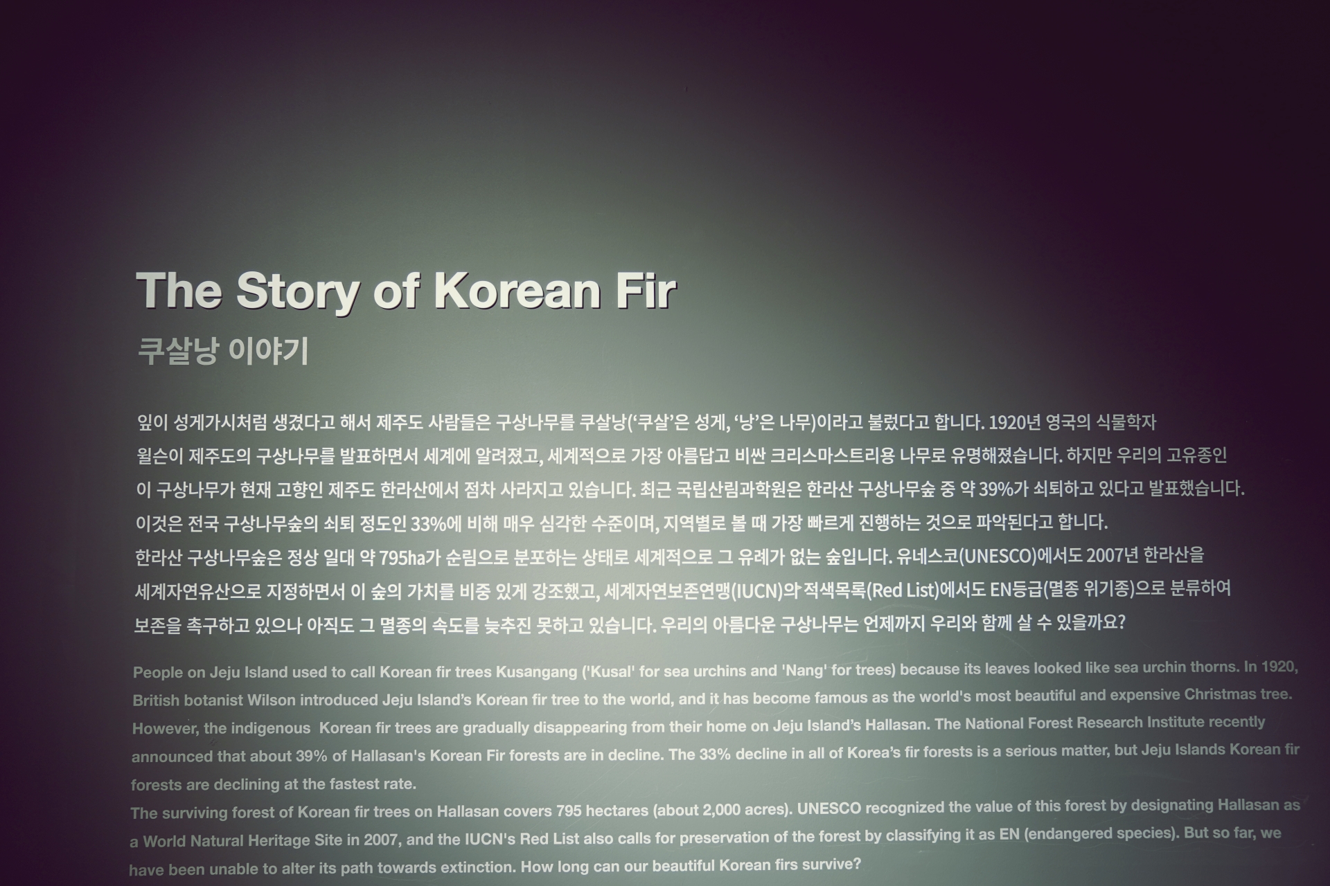 특히 한라산이 고향인 '구상나무'에 대한 이야기가 있는 곳은 독특한 구성으로 현재도 사라져 가고 있는 한라산 구상나무가 앞으로 어떻게 변화될지 역설적으로 표현하고 있었습니다. 크리스마스트리 나무로 세계적으로 알려져 있는 나무가 사실 제주가 고향이라는 사실에 더욱 놀랍기도 했습니다.
