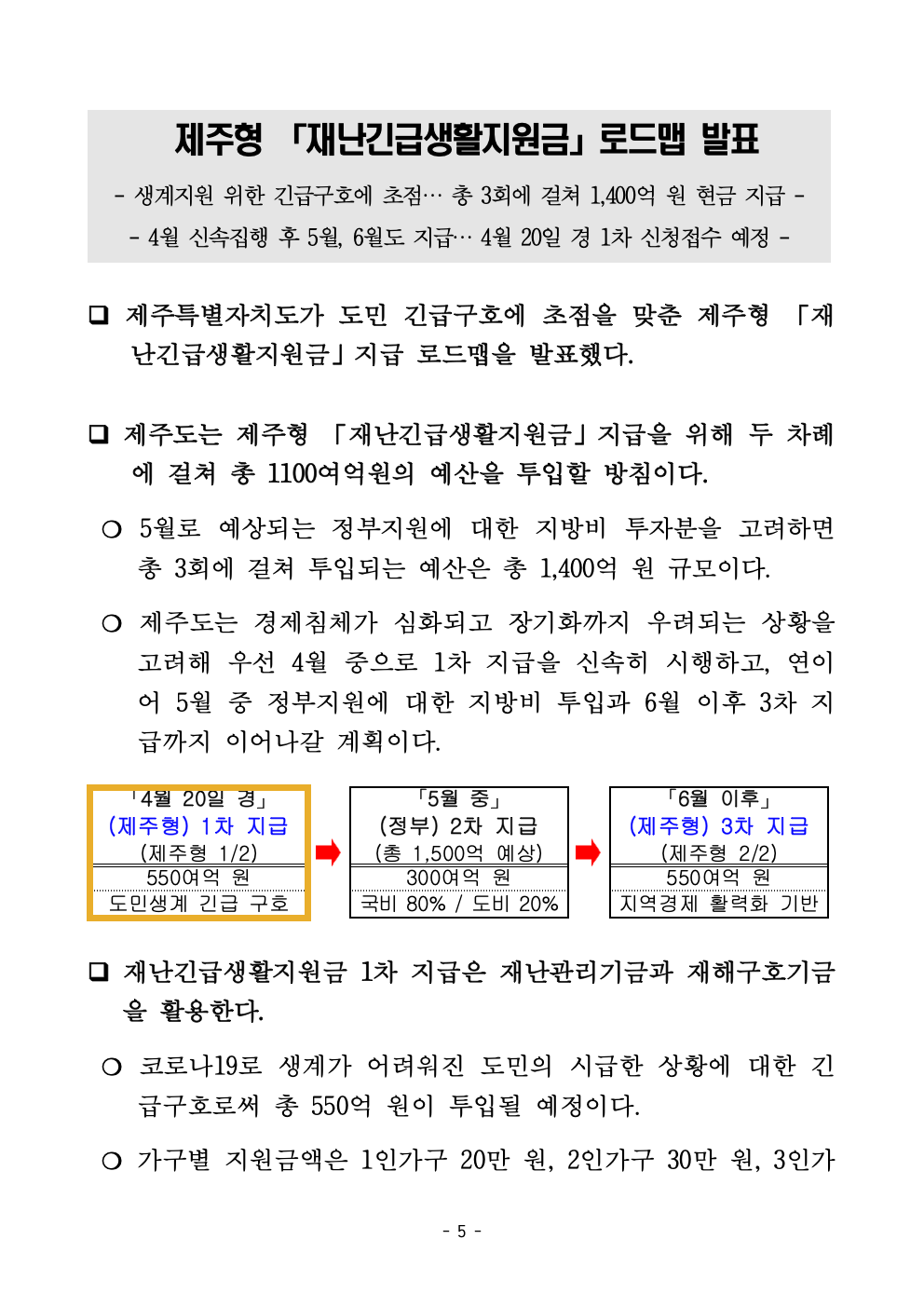 제주형 재난긴급생활지원금은 두 차례로 나뉘어 총 1,100여억원의 예산을 투입한다고 발표했습니다. 정부에서 지원하는 긴급재난지원금과 함께 생각한다면 4월 20일경 제주지원금을 1차로 지급받을 수 있고, 5월 중 정부에서 지원하는 긴급재난지원금을 2차로, 또한 6월 이후 제주지원금을 3차로 지급받는 과정을 거쳐 총 세 차례의 생활지원금을 받을 수 있는 구조입니다. 물론 정부와 제주도가 제시한 모든 조건에 맞았을 때입니다.