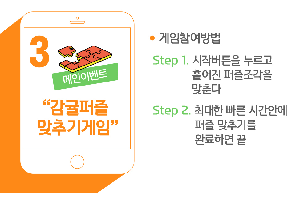 마지막 세 번째 이벤트는 온라인감귤꽃페스티벌 홈페이지에서 참여할 수 있는 '감귤퍼즐 맞추기'입니다. 감귤박람회 홈페이지에 로그인 후 감귤퍼즐맞추기 게임을 즐기면 참여 완료! 혹시 회원가입이 되어있지 않다면 가입 후 참여하시면 됩니다.