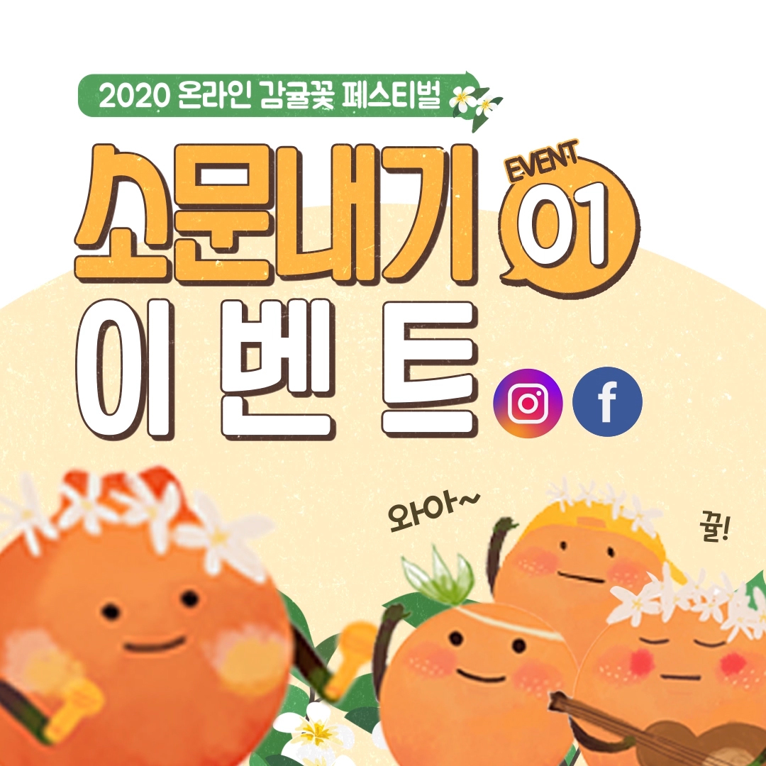 첫 번째 이벤트는 바로 온라인감귤꽃페스티벌을 널리 널리 알리는 '소문내기 이벤트'입니다! 감귤박람회 페이스북 페이지를 좋아요, 또는 인스타그램 팔로우 후 댓글로 친구를 소환(태그)하면 간단하게 이벤트에 참여가 가능합니다! 좋아요 또는 팔로우하고 댓글로 친구를 소환하면 참여할 수 있는 소문내기 이벤트~ 정말 쉽죠? 제주감귤박람회 SNS 계정은 아래의 링크에서 접속할 수 있습니다.