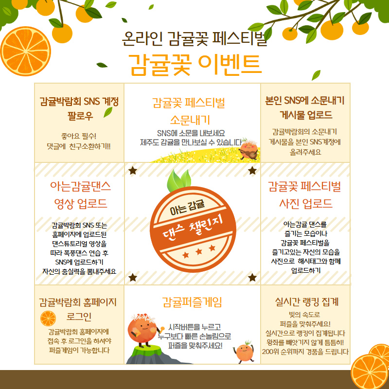 마지막으로 '2020온라인감귤꽃페스티벌'의 이벤트 내용을 한눈에 볼 수 있게 안내해 드리겠습니다. '온라인 감귤꽃 페스티벌 소문내기', '아는감귤 댄스챌린지', '감귤퍼즐 맞추기 게임' 등 다양한 이벤트에 여러분들의 많은 관심과 참여를 부탁드립니다!