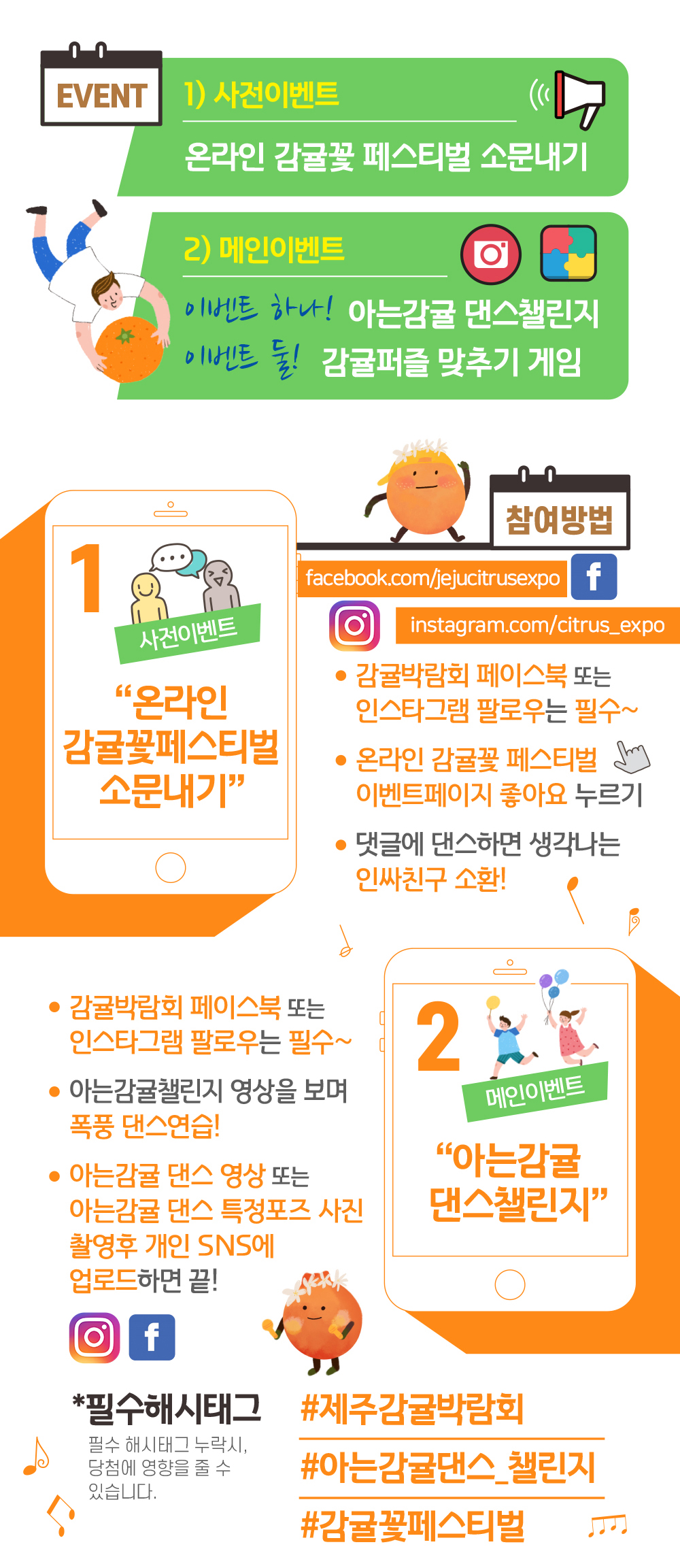 두 번째 이벤트는 여러분의 춤실력을 뽐낼 수 있는 '아는감귤 댄스챌린지'입니다. 춤에 관심이 있다면 누구나 참여가 가능합니다. 감귤박람회 페이스북 페이지를 좋아요, 또는 인스타그램 팔로우 후 열심히 아는감귤 댄스를 연습하고 댄스영상이나 사진을 개인 SNS에 업로드하면 자동으로 이벤트 참여가 완료됩니다.
