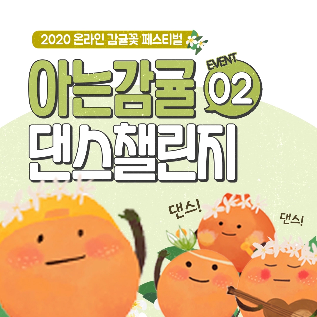마지막으로 '2020온라인감귤꽃페스티벌'의 이벤트 내용을 한눈에 볼 수 있게 안내해 드리겠습니다. '온라인 감귤꽃 페스티벌 소문내기', '아는감귤 댄스챌린지', '감귤퍼즐 맞추기 게임' 등 다양한 이벤트에 여러분들의 많은 관심과 참여를 부탁드립니다!