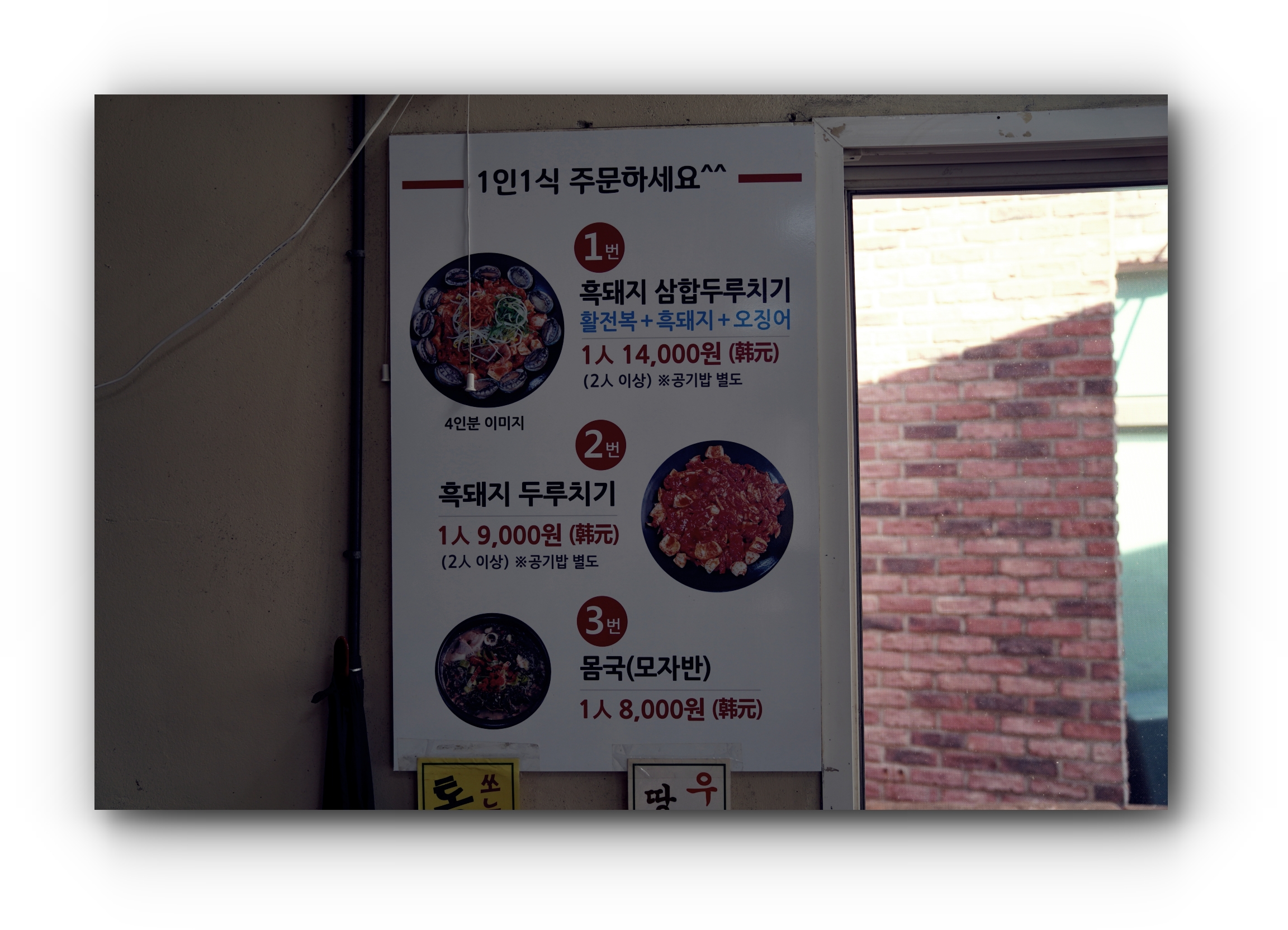 성산흑돼지두루치기의 메뉴는 흑돼지삼합두루치기, 흑돼지두루치기, 몸국 이렇게 세 종류입니다. 삼합두루치기의 가격이 더 비싸기를 하지만 활전복과 흑돼지, 그리고 오징어가 함께 들어있는 흑돼지삼합두루치기를 즐겨먹습니다. 이왕 먹는김에 흑돼지와 전복을 먹어주면 더 좋겠다는 생각이죠. 아참, 그리고 밥을 먹을 땐 국이 있으면 더 좋아서 몸국도 하나 추가로 주문을 합니다.